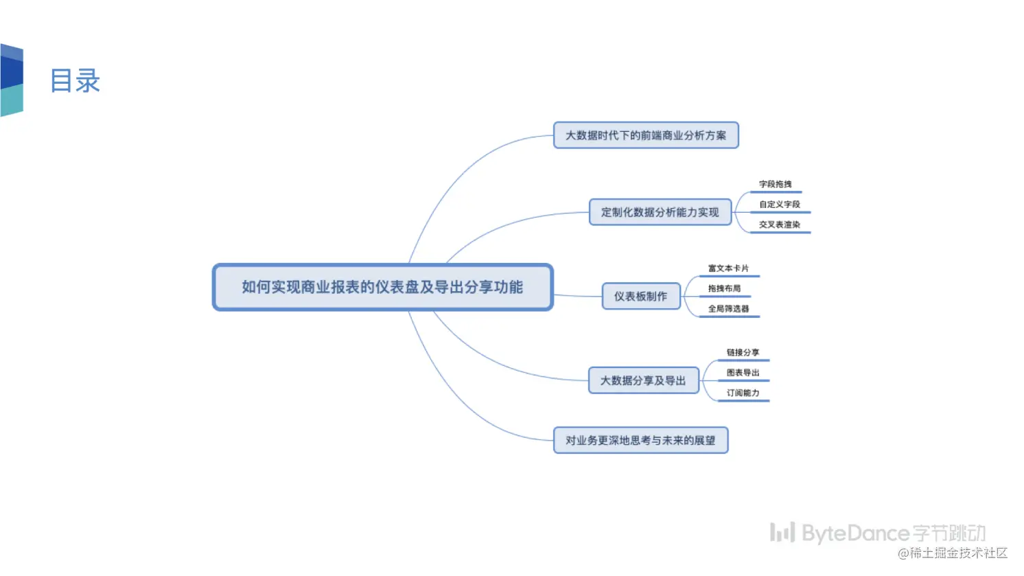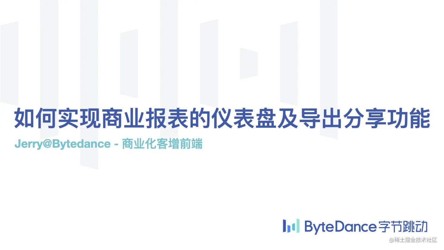 Hello 大家好,我是来自字节跳动商业产品客增大前端团队的前端工程师 Jerry,很荣幸今天能代表团队向大家一起分享我们最近的一些业务实践,因为我们现在刚好在做一款商业 BI 系统,所以适逢今天的主题,我将为大家带来一场 title 为《如何实现商业报表的仪表盘及导出分享功能》的技术沉淀。