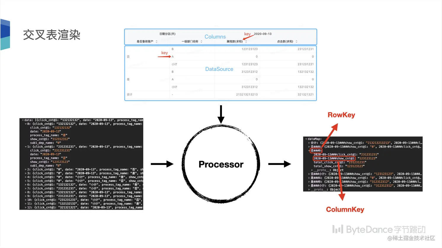 我们可以对数据图表进行细化,如果要渲染一个单元格的数据,那么这个数据单元格一定会有一个唯一的坐标,坐标从哪来呢?其实就是他的行列字段所组成的数据索引。我们可以封装一个数据处理器,就是我们图中的 Processor,对后端给到的数据 list 进行结构化,变成更加直观的 DataMap。