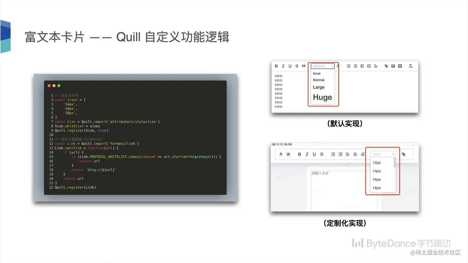 不仅如此,我们还可以为 Quill 增加一些自定义的功能,比如 Quill 默认只支持四种字号,所以我们也能赋予它定制化字号: