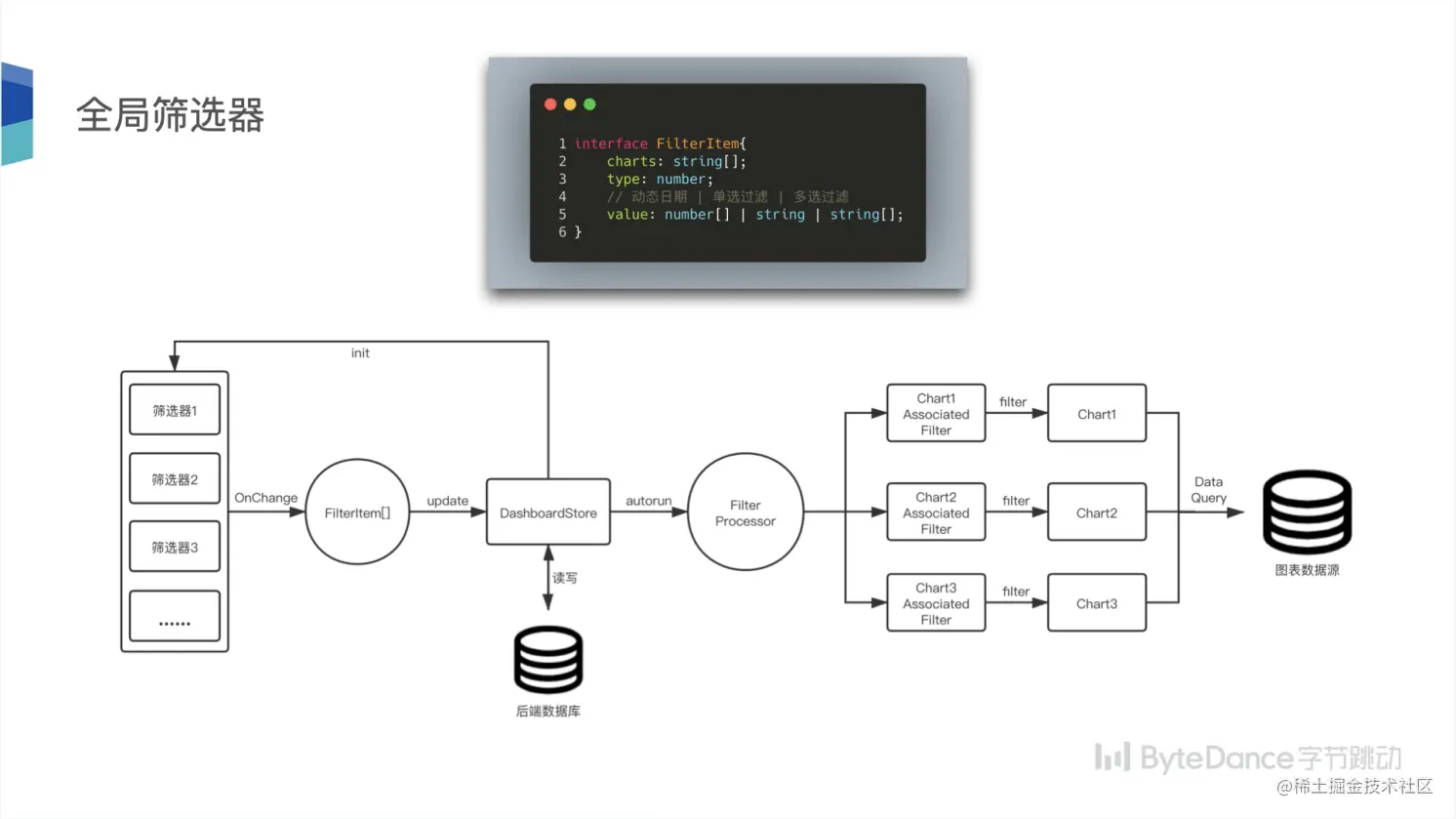 那这样的逻辑又要如何用技术实现呢?整理的流程就像我们图中所示,我们可以在 Store 里去统一收集所有的筛选器,筛选器上都会有一个字段标明关联的图表的信息,当筛选器发生变化时,就会自动更新我们的 Store,Store 会自动触发筛选器的生成器,针对不同的图表生成不同的筛选项,图表再根据不同的筛选项去向后端请求数据。