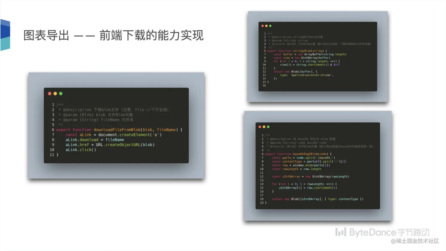 对于我们的文件而言,比较常见的就是一个 file string,图片类型的,大部分也可以导出一个 base64,我们都可以封装好工具函数,将他们转化成 Blob 对象。最终让用户能够灵活地完成下载。