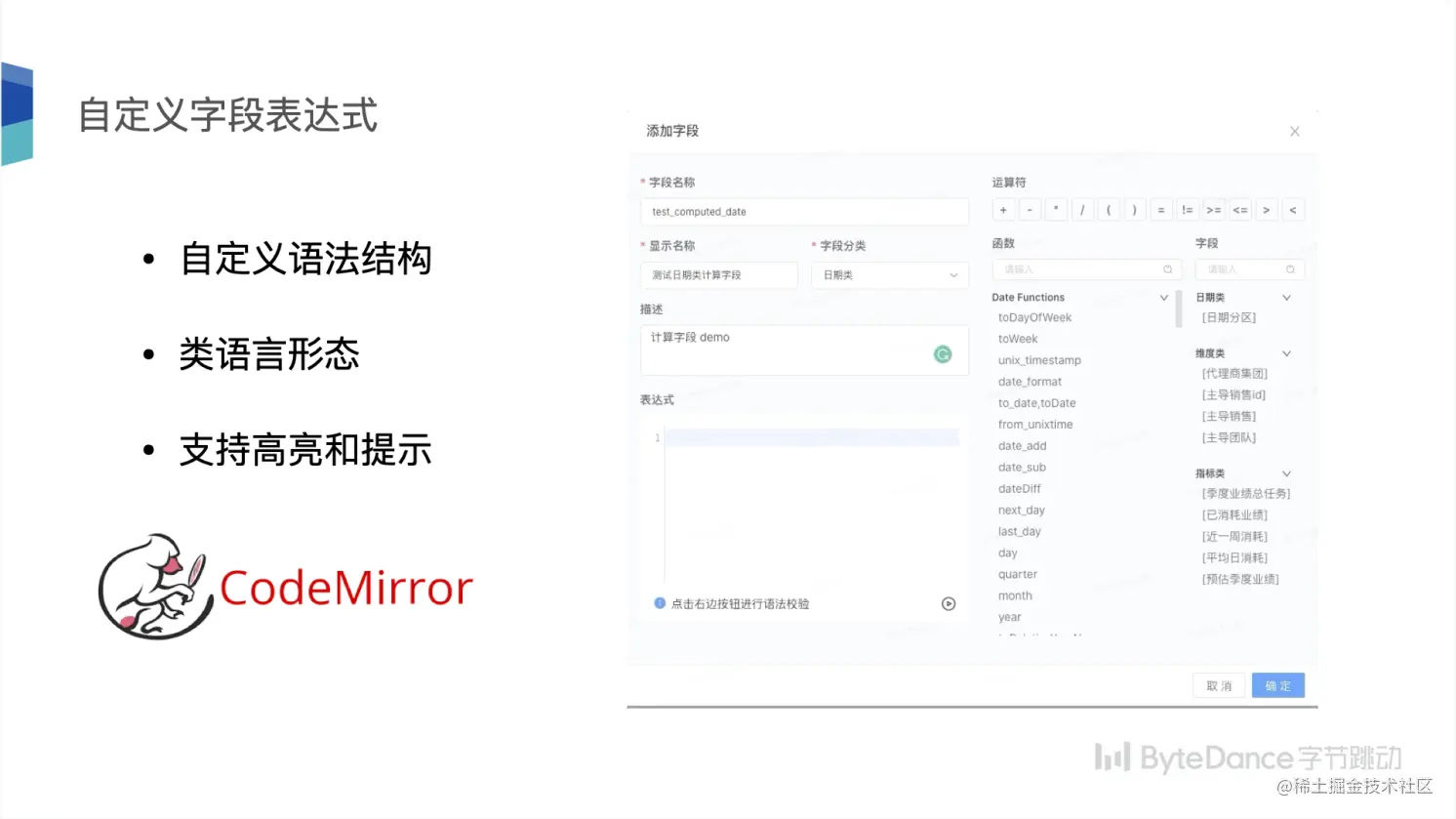有了字段拖拽之后,用户并不满足于我们提供的默认字段,很多时候,用户都希望自己能有自定义字段表达式的能力。我们可能不会让用户完整去写复杂的 SQL,我们希望这个系统能够更加简易,能够降低门槛服务于更多的用户,因此我们有了自定义的语法结构,比如由我们提供的函数和字段,用户就可以快速地组装好一个表达式,正如我们图中的动图所示。