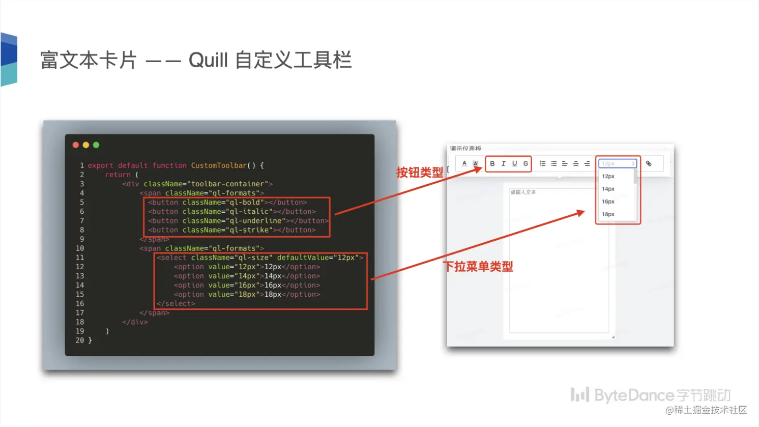 比如我们可以自定义工具栏的内容。我们可以通过自由组装 HTML 标签的形式,自定义富文本工具栏的呈现。比如 说 Button 元素,它最终在这样一个工具栏中渲染出来的就是一个按钮,比如说我们这样的一个加粗功能的按钮,或者是一个添加下划线的功能按钮。然后像有一些下拉菜单这样的功能,我们可以通过 select 配合 option 快速实现,比如选择字体字号,这也是一个比较常用的实现。