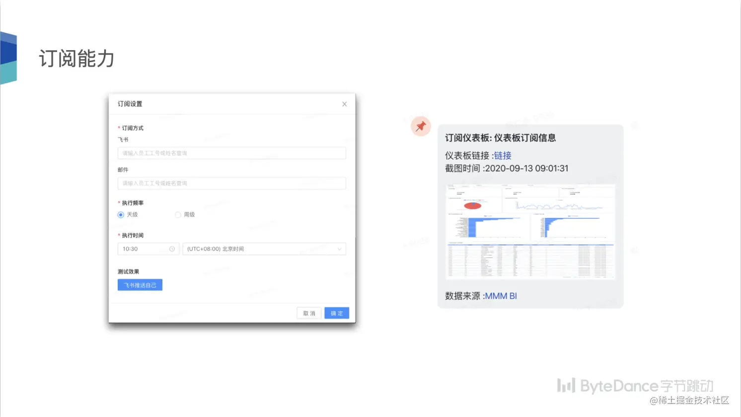 最终一个形式化其实就是类似于我们右边这张图的呈现。如果用户订阅好了一份报表,系统就会定时地在飞书上为它推送这样一条消息,其中就包含了用户制作的报表的一个截图,然后还有一个报表对应的链接。