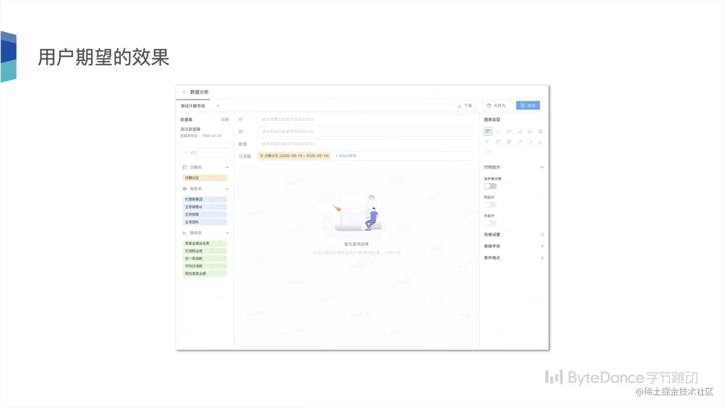 那用户期望的效果又是怎么样的呢?参考业内的系统实现,用户其实根本不需要关心背后繁杂的 SQL 逻辑来满足自己的数据查询,也不用自己绘制图表,只需要通过简单的通过一些拖拖拽拽,就像我们图中的动图所示,比如说拖拽一些我们提供好的数据字段,我们就可以快速地查询出这样的一个他所想要的数据,或者说是快速地帮他绘制出来一张图表,然后用户也可以自由地选择图表的类型,比如说想要做成一个折线图,或者是我们普通的这样一个 Table 样的交叉表。