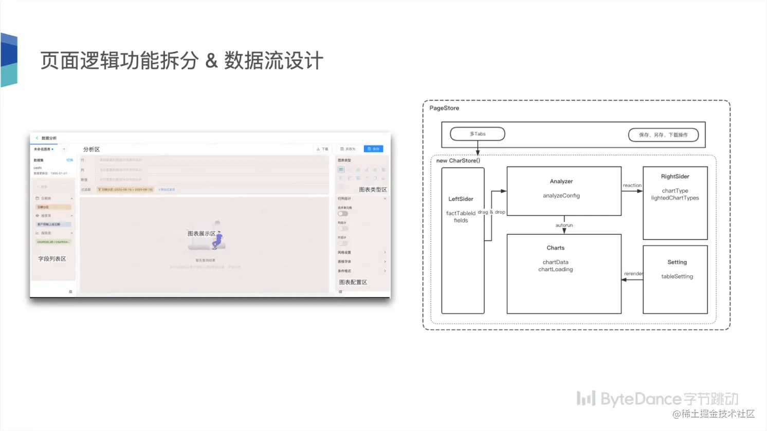 我们将刚才页面其实可以做一下类似图中各部分的功能拆分。首先是我们左侧的这样一个字段拖拽的 List,用户可以从这边去把字段拖入到像我们刚才看到这样的一个有行、列、数值分类的一个个容器里面,这部分的区域我们就叫他分析区,因为他是用来产出可用于后端查询的一个字段分析配置。借助 Mbox 的 Autorun 能力,当分析区配置变化之后,会自动触发后端查询获取到对应的图表数据,交给我们底部的面积比较大的核心图标展示区,用于展示我们绘制后的图表。