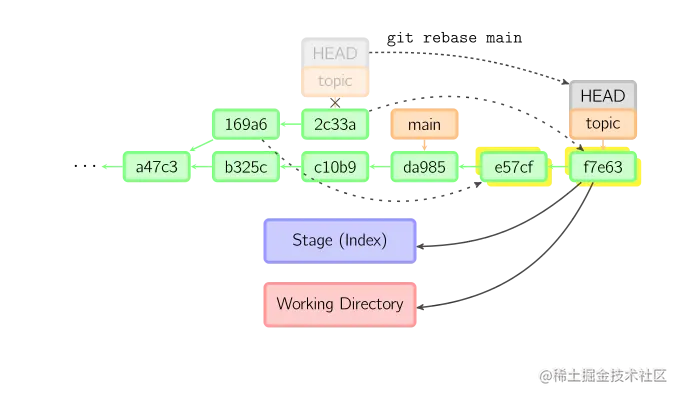 上面的命令都在topic分支中进行,而不是main分支,在main分支上重演,并且把分支指向新的节点。注意旧提交没有被引用,将被回收。
