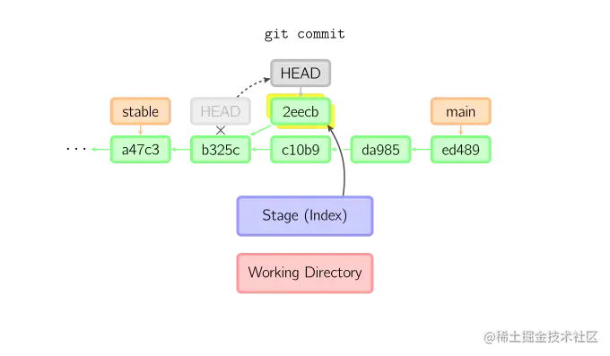 一旦此后你切换到别的分支,比如说main,那么这个提交节点(可能)再也不会被引用到,然后就会被丢弃掉了。注意这个命令之后就不会有东西引用2eecb。