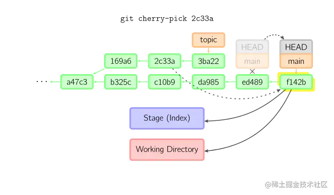 cherry-pick命令"复制"一个提交节点并在当前分支做一次完全一样的新提交。