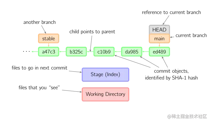 绿色的5位字符表示提交的ID,分别指向父节点。分支用橘色显示,分别指向特定的提交。当前分支由附在其上的HEAD标识。 这张图片里显示最后5次提交,ed489是最新提交。 main分支指向此次提交,另一个stable分支指向祖父提交节点。