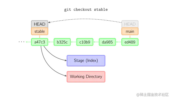 当不指定文件名,而是给出一个(本地)分支时,那么HEAD标识会移动到那个分支(也就是说,我们“切换”到那个分支了),然后暂存区域和工作目录中的内容会和HEAD对应的提交节点一致。新提交节点(下图中的a47c3)中的所有文件都会被复制(到暂存区域和工作目录中);只存在于老的提交节点(ed489)中的文件会被删除;不属于上述两者的文件会被忽略,不受影响。