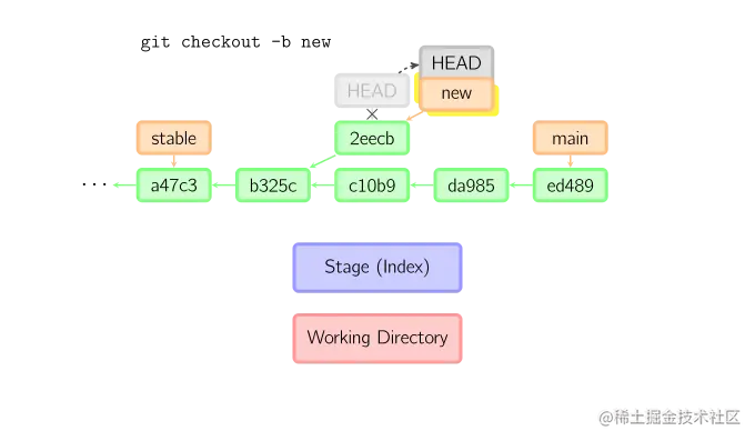 一旦此后你切换到别的分支,比如说main,那么这个提交节点(可能)再也不会被引用到,然后就会被丢弃掉了。注意这个命令之后就不会有东西引用2eecb。