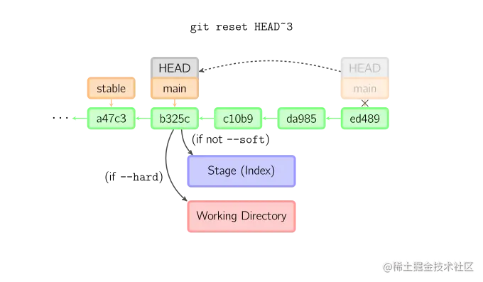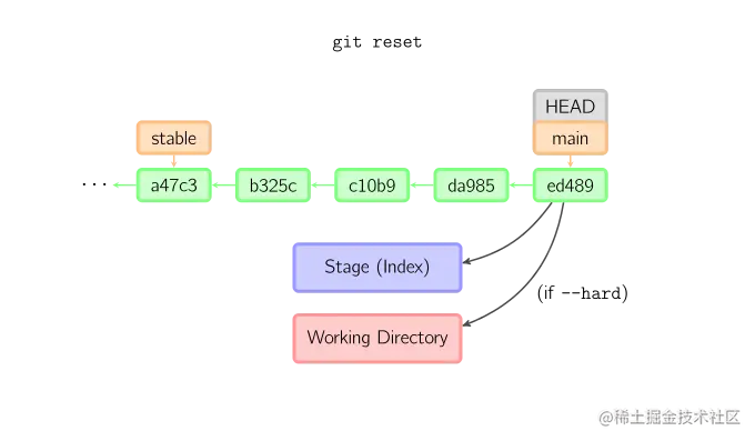 如果没有给出提交点的版本号,那么默认用HEAD。这样,分支指向不变,但是索引会回滚到最后一次提交,如果用--hard选项,工作目录也同样。