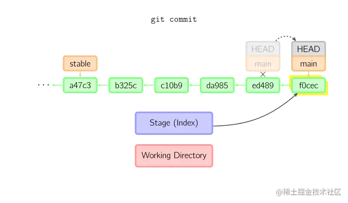 提交时,git用暂存区域的文件创建一个新的提交,并把此时的节点设为父节点。然后把当前分支指向新的提交节点。下图中,当前分支是main。 在运行命令之前,main指向ed489,提交后,main指向新的节点f0cec并以ed489作为父节点。