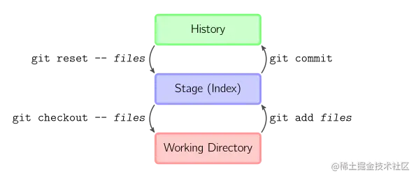 git add *files*把当前文件放入暂存区域。git commit给暂存区域生成快照并提交。git reset -- *files*用来撤销最后一次git add *files*,你也可以用git reset撤销所有暂存区域文件。git checkout -- *files*把文件从暂存区域复制到工作目录,用来丢弃本地修改。