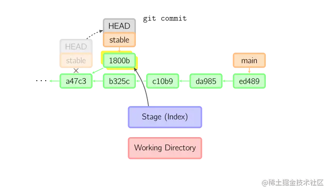 绿色的5位字符表示提交的ID,分别指向父节点。分支用橘色显示,分别指向特定的提交。当前分支由附在其上的HEAD标识。 这张图片里显示最后5次提交,ed489是最新提交。 main分支指向此次提交,另一个stable分支指向祖父提交节点。