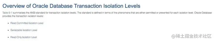前面我们说过,Oracle只只支持ANSI/ISO SQL定义的Serializable和Read Committed,其实,根据Oracle官方文档给出的介绍,Oracle支持三种隔离级别: