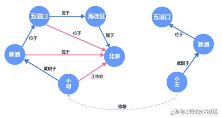 以小明为例,小明就职于位于五道口的新浪,系统可以推测出小明在北京工作。并将同样在北京新浪工作的小王推荐给了他。在下图中,蓝色的箭头表示表示已存在的关系,红色箭头为知识图谱补全后的关系。