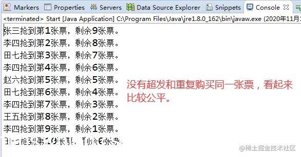 解析:通过以上结果可知,这个线程算是安全的,但却有弊端,没有公平性可言,有些用户压根抢不到票,有些用户则抢到了好几张票。
