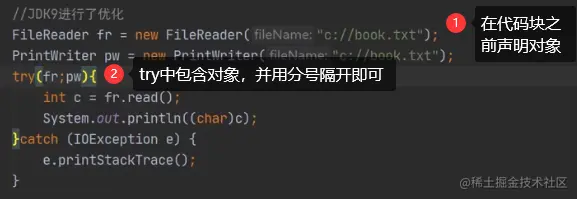2)但是,如果后面还有代码块需要用到try中的对象时,就显得不方便了。JDK9进行了改进