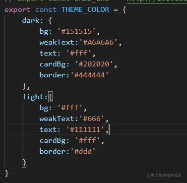 config配置信息在config文件下,然后对应dark与light模式下颜色配置,然后我需要通过useColorScheme中获取的值直接对应这个Object的字段key就可以了,配置文件如下