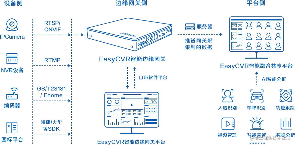 EasyCVR智能边缘网关是TSINGSEE青犀视频旗下软硬一体的一款产品,可提供多协议的设备接入、采集、AI智能检测与识别、处理、分发等服务。通过对视频监控场景中的人、车、物等进行抓拍、检测与识别,对异常情况进行智能提醒和通知,可广泛应用于安防监控、智能分析、通行核验等场景。