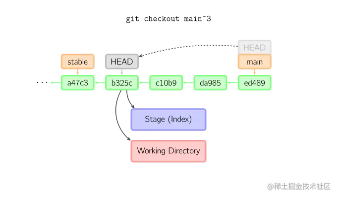 如果既没有指定文件名,也没有指定分支名,而是一个标签、远程分支、SHA-1值或者是像main~3类似的东西,就得到一个匿名分支,称作detached HEAD(被分离的HEAD标识)。这样可以很方便地在历史版本之间互相切换。比如说你想要编译1.6.6.1版本的git,你可以运行git checkout v1.6.6.1(这是一个标签,而非分支名),编译,安装,然后切换回另一个分支,比如说git checkout main。然而,当提交操作涉及到“分离的HEAD”时,其行为会略有不同,详情见在下面。