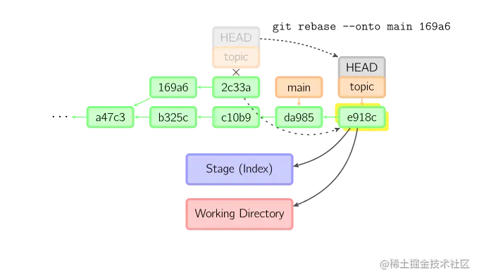 要限制回滚范围,使用--onto选项。下面的命令在main分支上重演当前分支从169a6以来的最近几个提交,即2c33a。