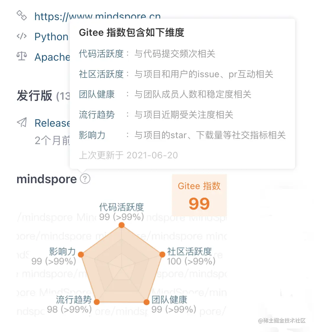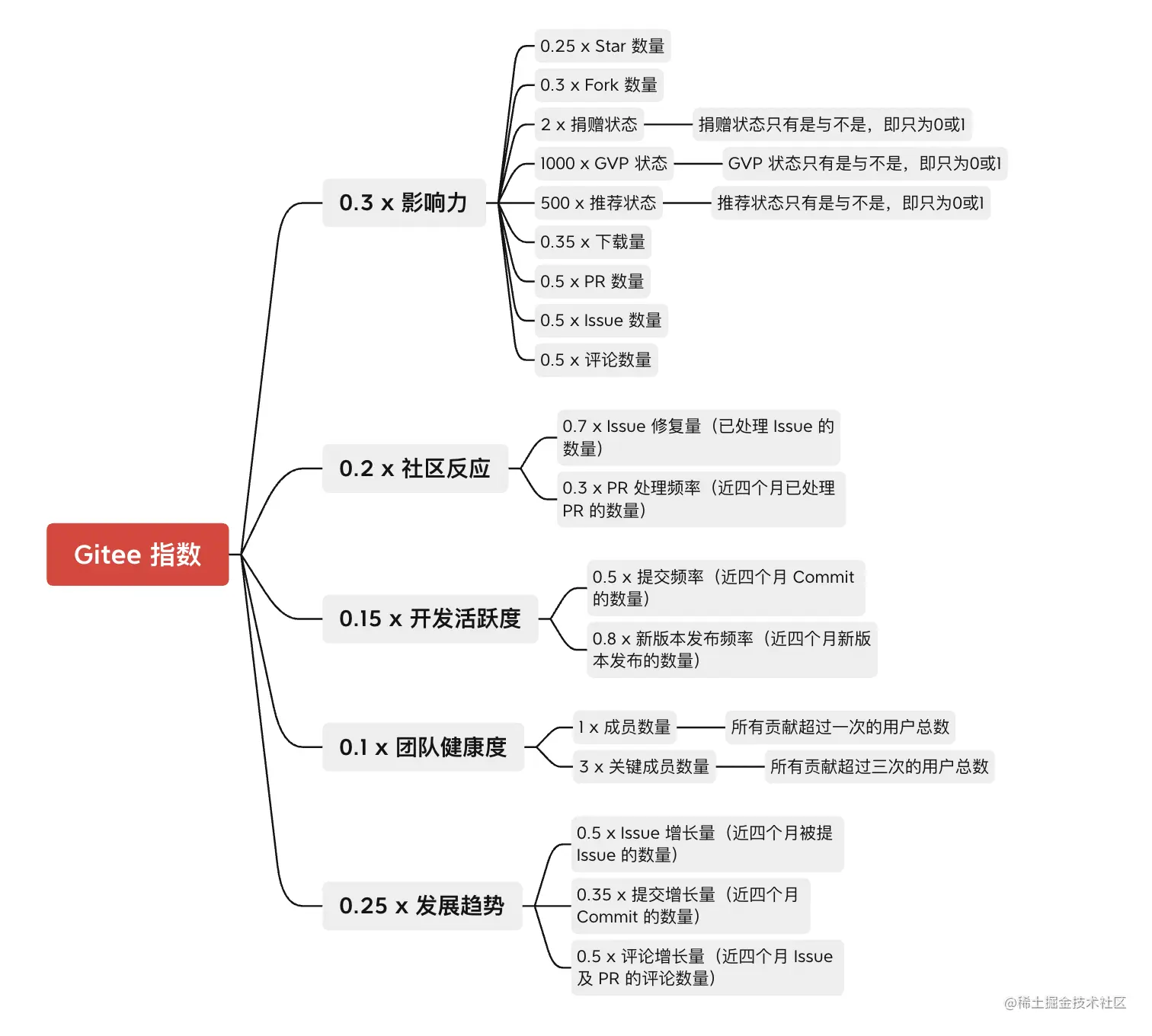 经常逛 Gitee 的同学一定会注意到,在 Gitee 上衡量一个开源项目优质与否,除了 Star 的数量以外,还有一个很重要的指标——Gitee 指数。如果该项目 Star 数量很多但 Gitee 指数较低,那么该项目可能“年久失修”或已无人维护,如果该项目 Star 数量并不多但 Gitee 指数较高,那么说明这个项目是个“潜力股”,值得持续关注。