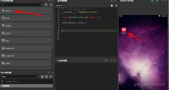 我们就是用我们说的跨平台API模块中的方法来操作我们的APK,下面来看下吧。我们先点击Touch,然后框选App所在的区域,如图: