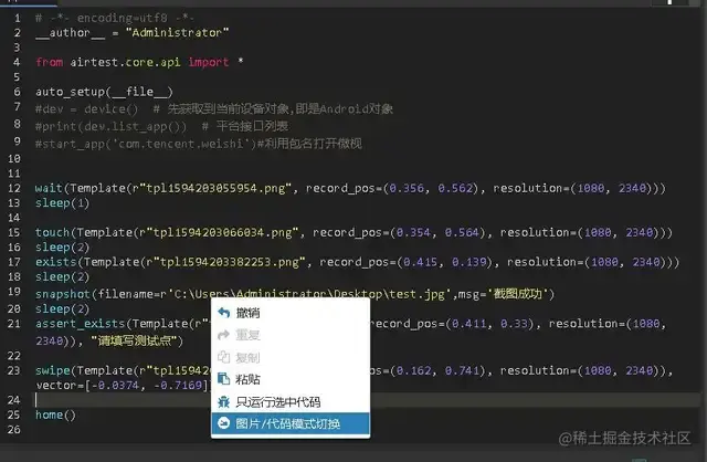只需选中图片代码模式切换即可,我们所截取的图片都在这个文件里,大家可以去看看就知道了。其实这个就是PY文件里的内容。