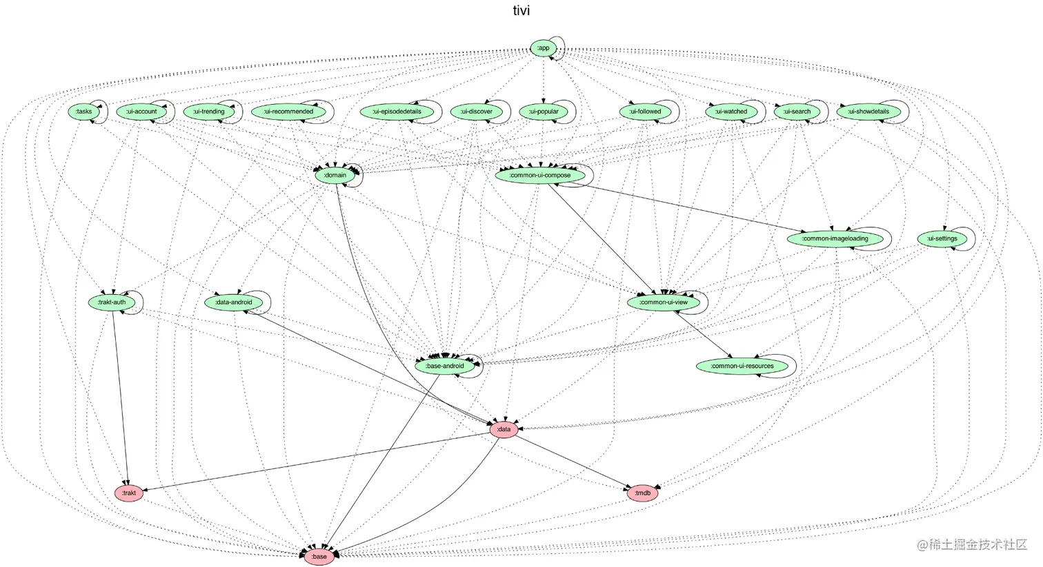 △ Tivi 的模块图,使用 Jake Wharton 所提供的,十分方便的 Gradle 任务 生成
