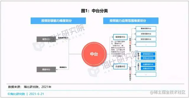 既然中台是封装能力的集合,那么海比研究院就从这个角度入手,对中台作如下分类。首先按照封装能力维度划分,如果封装的是业务模块能力就是业务中台,如果封装的是数据能力就是数据中台。其次是按照能力应用范围维度划分,可以分为场景级中台和企业级中台。场景级中台可以进一步细分为营销场景中台、采购场景中台和财务场景中台等;企业级中台按照企业所在的行业分为零售中台、金融中台等,若再和数据中台和业务中台交叉,可以得到零售数据中台、零售业务中台、金融数据中台和金融业务中台等更加细分的市场。