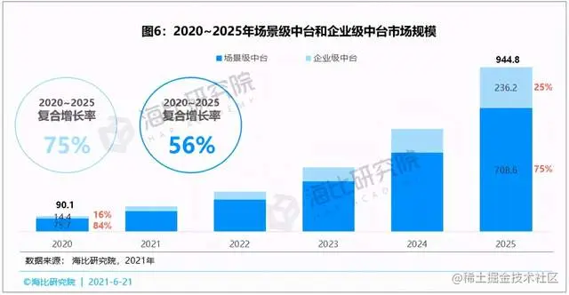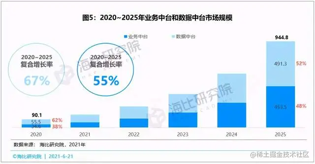 之前提到过,2020年中台市场规模为90.1亿元,其中数据中台占比62%,业务中台占比38%,数据中台市场份额较高的主要原因在于数据中台见效快,其价值更容易得到验证,从而被用户认可。海比研究院认为,从用户长远发展来看,业务中台和数据中台均有建设必要性,未来业务中台呈追赶趋势,将与数据中台市场占比逐渐趋同,从增速角度来看,2020至2025年业务中台市场年均复合增长率为67%,数据中台市场的增长率为55%。预计数据中台占比由2020年的62%降至2025年的52%,而业务中台由38%提升至48%。