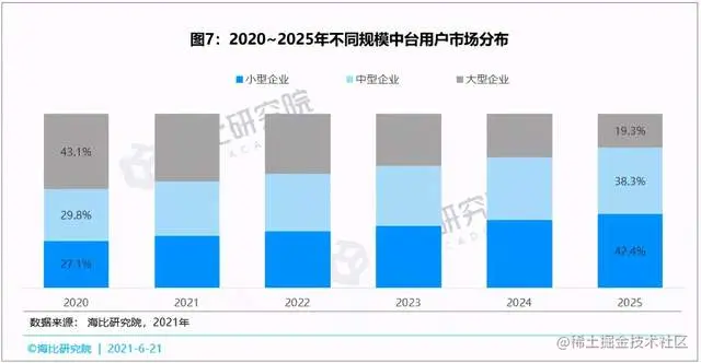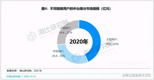 最后按照用户规模,可以细分出大型用户中台市场、中型用户中台市场和小型用户中台市场。海比研究数据表明,大型用户中台市场规模最大,达到38.8亿元,占比为43%,其次是中型用户中台市场,占比30%,最小的是小型用户中台市场,占比为27%。数据表明,中台虽然在大型用户市场先落地,但中小型用户也是适用的,并且市场规模已经超过一半以上。