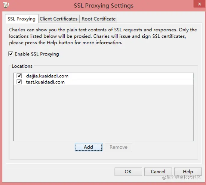 - 点击Add,在“Edit Location”窗口填写所需抓取的Host,如test.kuaidadi.com和daijia.kuaidadi.com,Port可以空着,点击“OK”