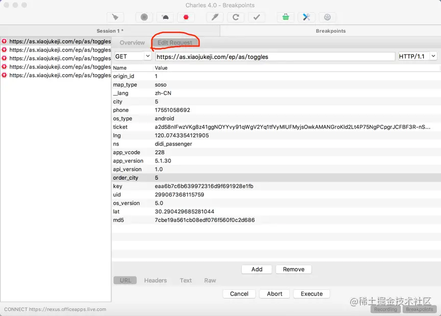 最后,当请求触发后,可以点击Edit Request对参数进行增删改,然后点击Execute继续执行请求: