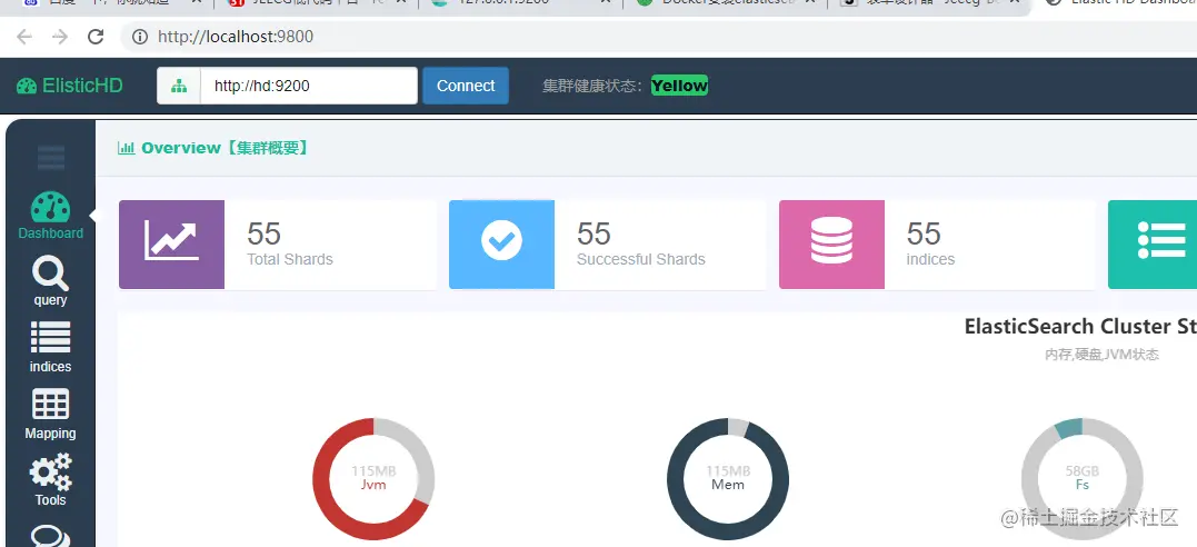 打开 http://localhost:9800 。默认未连接,手工修改连接为 http://hd:9200