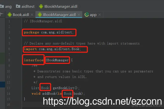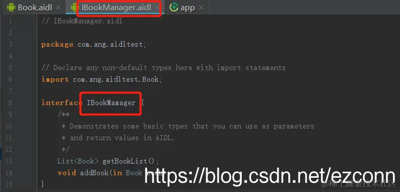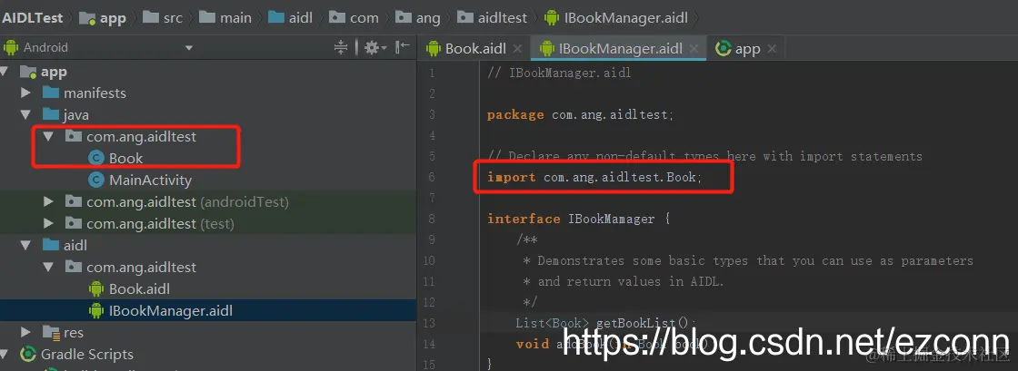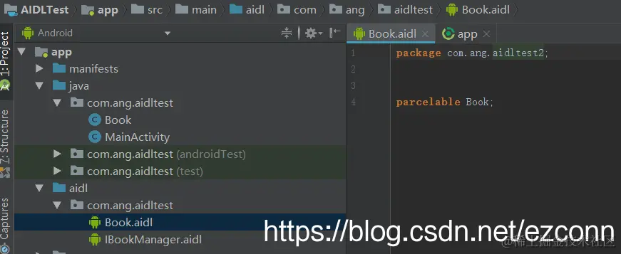7,声明了自定义Parcelable对象(上例中Book继承了Parcelable) 的aidl文件名,必须和Parcelable对象名一致;如上例中的:Book.aidl和Book.class