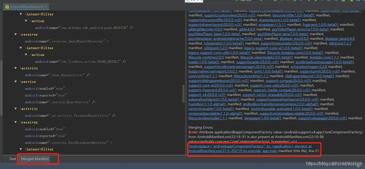 2,也可以在Androidstudio 中点开AndroidManifest的Merged Manifest右边有具体的报错信息和建议