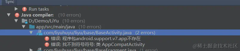 6,编译,这时Androidstuido 把之前引用过V4和V7的类全部以错误的形式列出来,如下图:找不到包的错误信息;把报错的地方导入的V4和V7包全部删掉,从新导入Androidx包即可;