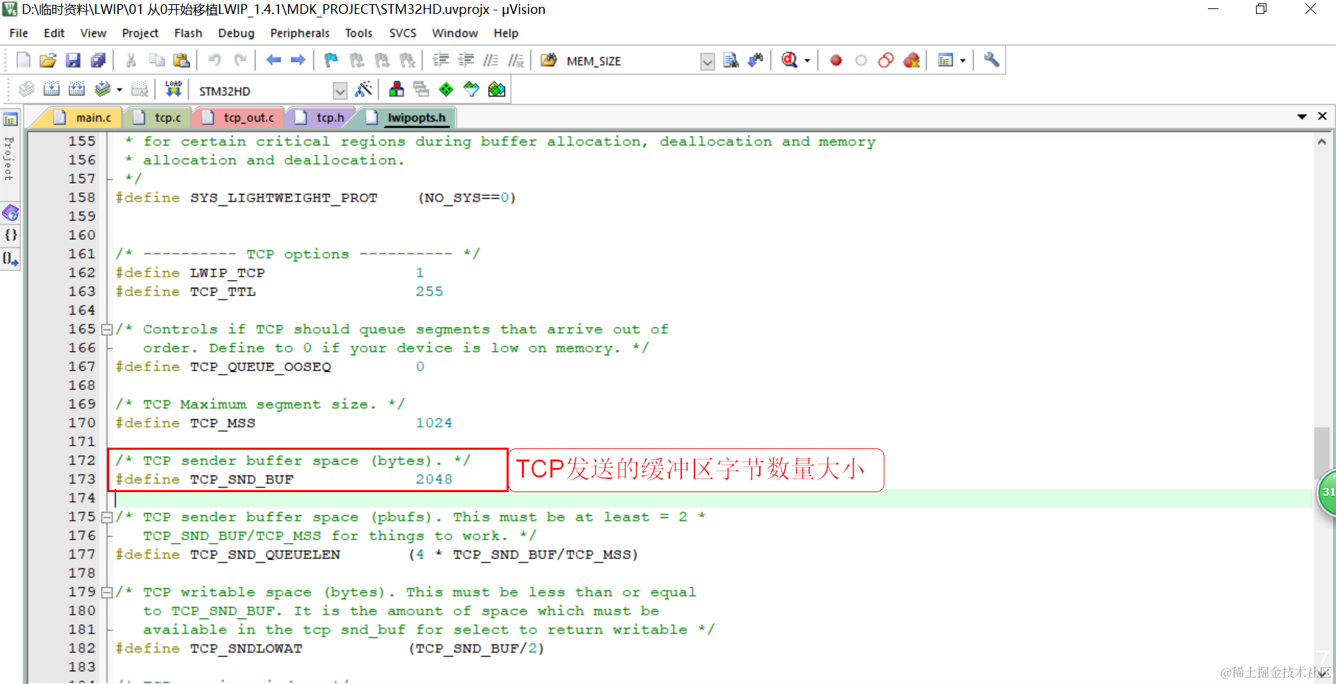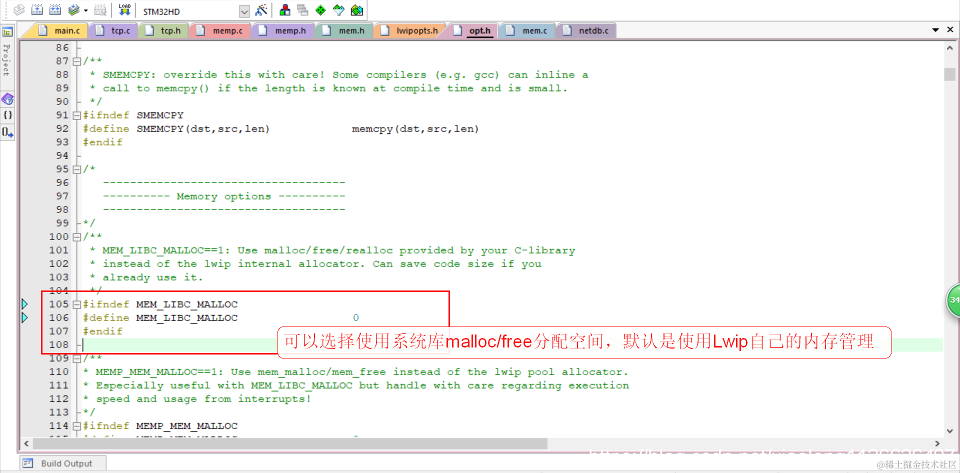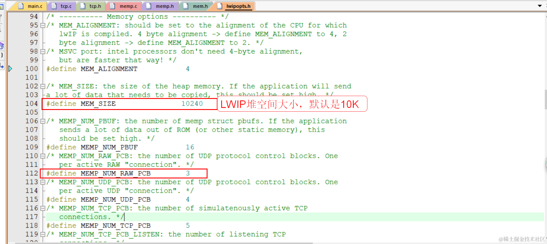 LWIP可以选择使用系统库自带的函数malloc/free进行管理空间,也可以使用lwip自己的内存管理函数进行管理,源码默认就是使用lwip自己的内存管理方法,就是在初始化内存的时候定义一个数组,数组的大小在lwipopts.h文件MEM_SIZE宏定义的。