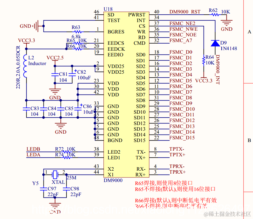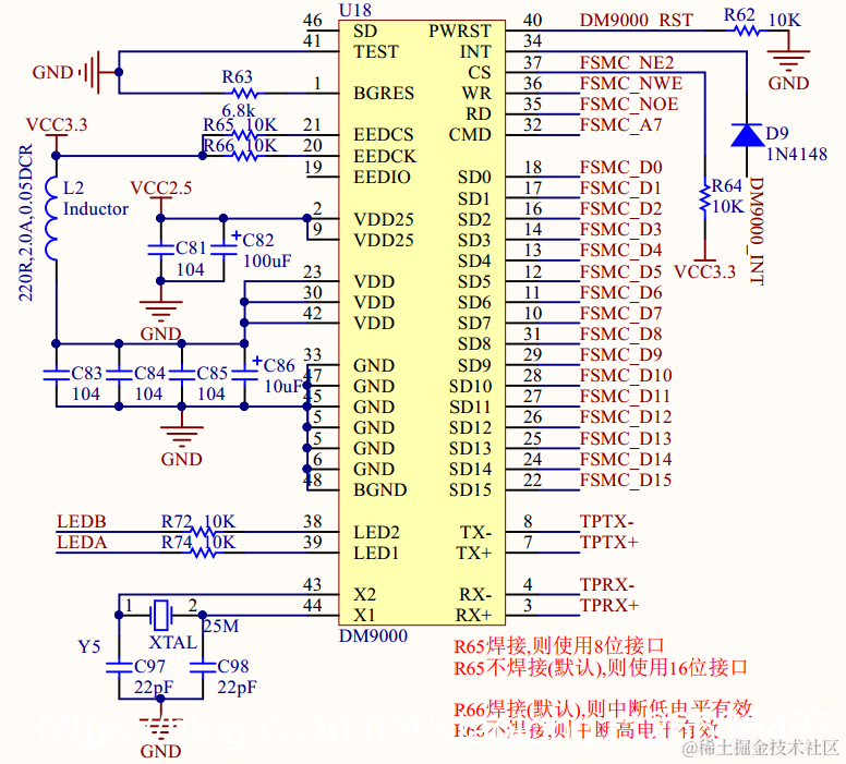 DM9000的34(INT)引脚为中断输出引脚,默认情况下该引脚高电平有效。可以通过设置DM9000 的 20(EECK)引脚来改变 INT 的有效电平,当 EECK 拉高以后, INT 低电平有效,否则的话 INT 是高电平有效的。开发板上 R66 电阻为 EECK 的上拉电阻,因此开发板上 DM9000 的 INT 引脚是低电平有效的。
