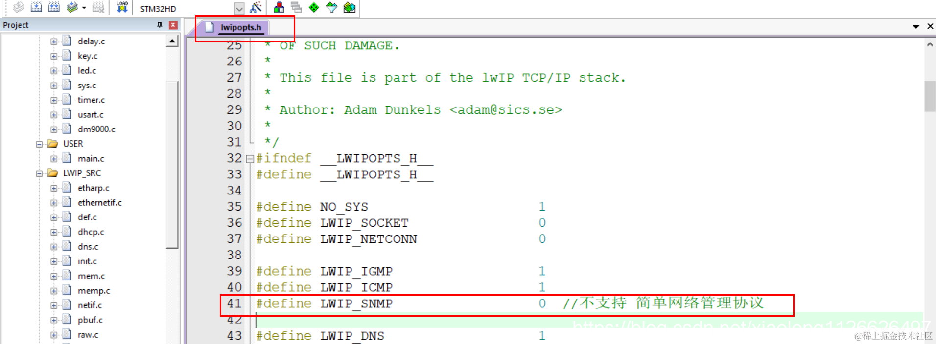 本篇文章主要讲解如何在STM32F103工程里添加移植LWIP协议,最终完成TCP服务器、TCP客户端的通信测试。 网卡采用的是DM9000,工程代码中,采用STM32的FSMC接口来驱动DM900网卡,DM9000是并口网卡,引脚多,但是速度快,也可以采用其他网卡,SPI协议的、UART协议的等。 比如:ENC28J60。 因为主要是讲LWIP协议栈的移植,所以网卡相关的代码就没有细说(需要准备一个网卡可以正常通信的工程,再移植)。