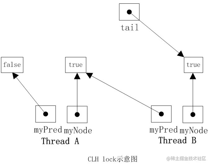 线程A需要获取锁,其myNode域为true,些时tail指向线程A的结点,然后线程B也加入到线程A后面,tail指向线程B的结点。