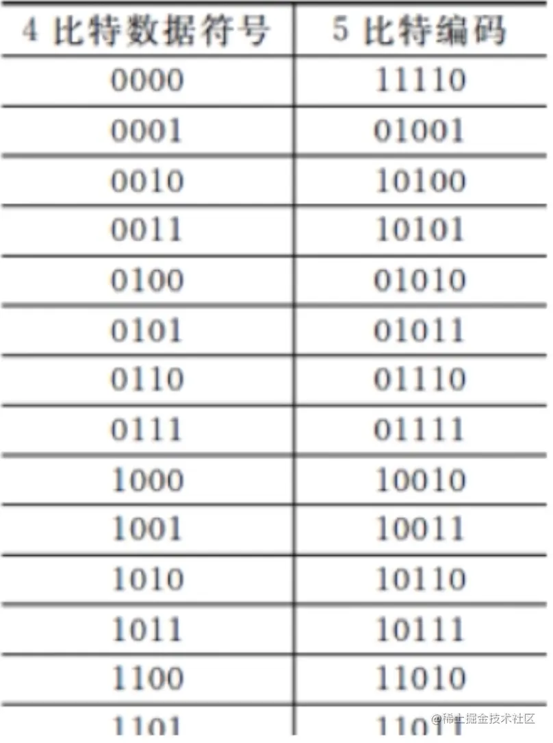 - 4B/5B编码:比特流中插入额外的比特以打破一连串的1或者1,就是使用5个比特来编码四个比特的数据,之后再将其传送给接收方,因此称之为4B/5B.编码的效率是80%。