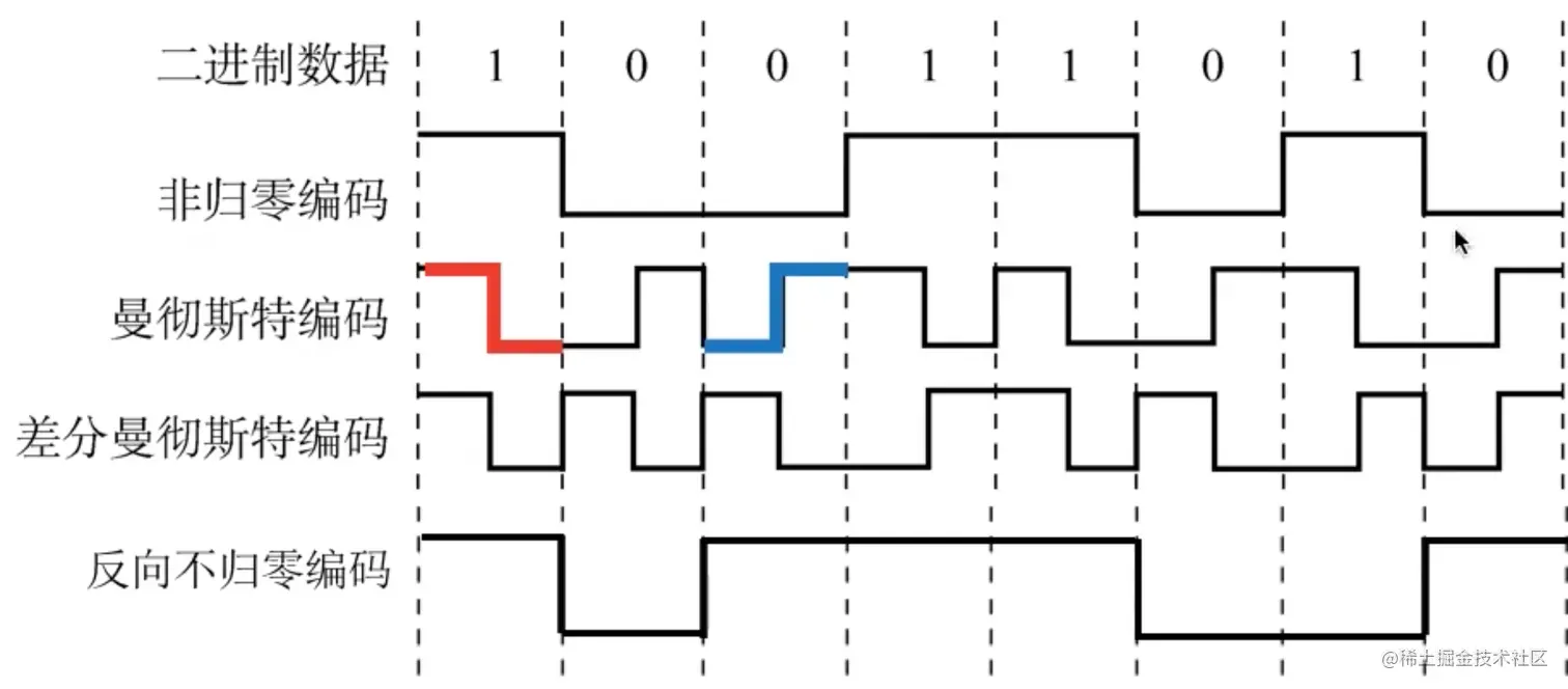 - 差分曼彻斯特编码:同1异0;常用于局域网的数据传输,规则是:如果前半个码元的电平和上一个码元的后半个电平相同则是 1,如果相反则是0。编码的特点是:每个码元的之间都有一次电平的跳转,可以实现自同步,且抗干扰性强于曼彻斯特编码