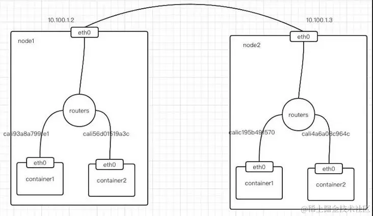 这些路由规则都是felix维护配置的,而路由信息则是calico bird组件基于BGP分发而来。calico实际上是将集群里所有的节点都当做边界路由器来处理,他们一起组成了一个全互联的网络,彼此之间通过BGP交换路由,这些节点我们叫做BGP Peer。