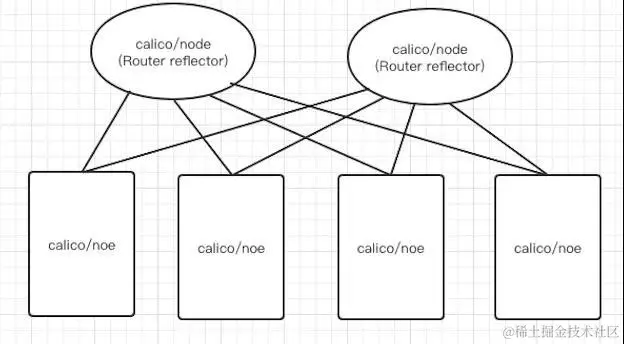 所以一般这种模式推荐的集群规模在50节点左右,超过50节点推荐使用另外一种RR(Router Reflector)模式,这种模式下,calico 可以指定几个节点作为RR,他们负责跟所有节点 BGP client 建立通信来学习集群所有的路由,其他节点只需要跟RR节点交换路由即可。这样大大降低了连接数量,同时为了集群网络稳定性,建议RR>=2.