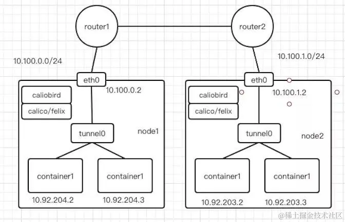 以上的工作原理依然是在二层通信,当我们有两台宿主机,一台是10.100.0.2/24,节点上容器网络是10.92.204.0/24;另外一台是10.100.1.2/24,节点上容器网络是10.92.203.0/24,此时两台机器因为不在同个二层所以需要三层路由通信,这时calico就会在节点上生成如下路由表: